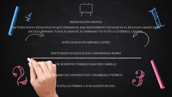 presentación digital: Factores socio-pedagógicos que generan el bajo rendimiento escolar en el segundo grado de la escuela primaria “Ignacio Manuel Altamirano” en Tuxtla Gutiérrez, Chiapas. Sofía Guadalupe Méndez Castro Doctorado en Educación, Universidad IEXPRO Dr. ROOSEVELT ENRIQUE SANCHEZ CARRILLO Seminario de constructos y desarrollo teórico Tuxtla Gutiérrez a 13 de agosto de 2023.