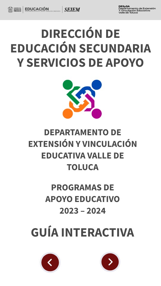 Los Programas de Apoyo Educativo, se organizan en tres grandes rubros: Fortalecimiento Curricular, Programas Compensatorios y Participación Social en la Escuela.Esta Guía Interactiva permite una consulta por programa y/o estrategia, objetivo y acciones para identificar cada una de lastemáticas.Se vincula con el Espacio Virtual del DEyVE, el cual conjunta toda la información disponible para su consulta y difusión; permite descargar y compartir materiales de apoyo, infografías, manuales, reglamentos, formatos, trípticos, visualizar videos de apoyo, ligas a sitios oficiales, entre otros; logrando así poner al alcance de sectores escolares, directivos y docentes, todo el abanico de recursos digitales que generan las instancias responsables de los programas. Su diseño, de fácil navegación, permite acceder desde cualquier dispositivo (celular, laptop, tableta o computadora de escritorio), permitiendo que el flujo de información sea más eficiente y dinámico. El Espacio Virtual del DEyVE se actualiza periódicamente con nuevos materiales y contenidos, para que la información sea útil y relevante como apoyo en el desempeño de la práctica docente.