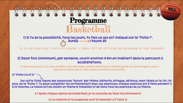3) "Fiche 2 a et b " Sur cette fiche figure des excercices "bonus" par thème (détente, attaque, défense, main faible et le tir). En plus, de la "fiche 1", tu peux compléter ton entraînement avec ces exercices. Chaque exercice est à faire pendant 5 à 10 minutes. Le mieux est de choisir un thème à travailler et de faire tous les exercices de ce thème.