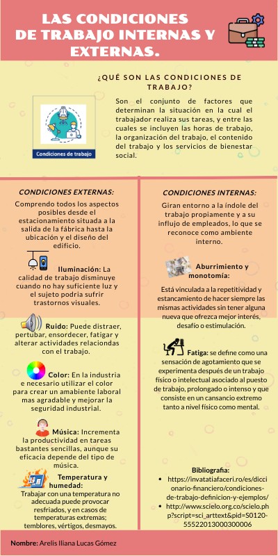 CONDICIONES EXTERNAS: Comprendo todos los aspectos posibles desde el estacionamiento situada a la salida de la fábrica hasta la ubicación y el diseño del edificio. Iluminación: La calidad de trabajo disminuye cuando no hay suficiente luz y el sujeto podria sufrir trastornos visuales. Ruido: Puede distraer, pertubar, ensordecer, fatigar y alterar actividades relaciondas con el trabajo. Color: En la industria e necesario utilizar el color para crear un amabiente laboral mas agradable y mejorar la seguridad industrial. Música: Incrementa la productividad en tareas bastantes sencillas, aunque su eficacia depende del tipo de música. Temperatura y humedad: