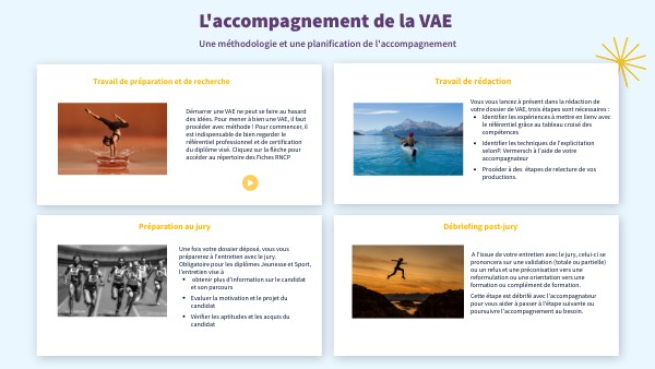 Démarrer une VAE ne peut se faire au hasard des idées. Pour mener à bien une VAE, il faut procéder avec méthode ! Pour commencer, il est indispensable de bien regarder le référentiel professionnel et de certification du diplôme visé. Cliquez sur la flèche pour accéder au répertoire des Fiches RNCP