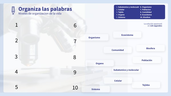 6. Organismo 7. Poblacion 8. Comididad 9. Ecosistema 10. Biosfera
