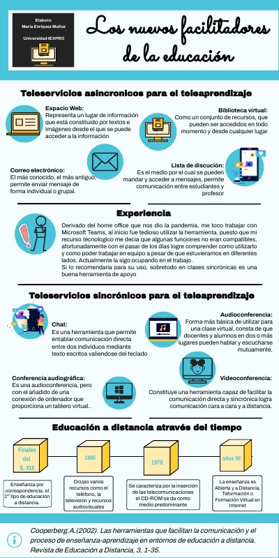 Cooperberg,A.(2002). Las herramientas que facilitan la comunicación y el proceso de enseñanza-aprendizaje en entornos de educación a distancia. Revista de Educación a Distancia, 3, 1-35.
