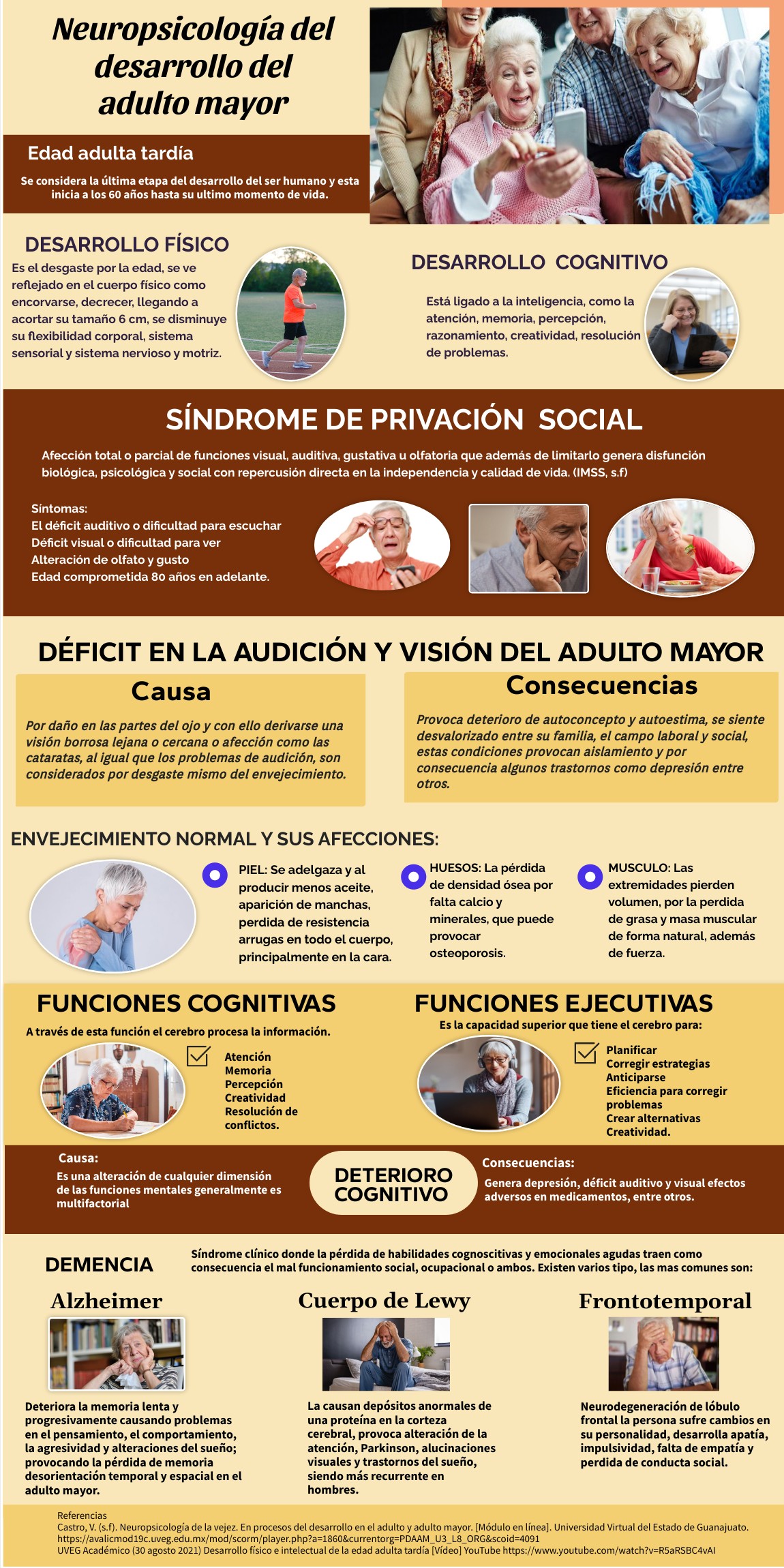 Castro, V. (s.f). Neuropsicología de la vejez. En procesos del desarrollo en el adulto y adulto mayor. [Módulo en línea]. Universidad Virtual del Estado de Guanajuato. https://avalicmod19c.uveg.edu.mx/mod/scorm/player.php?a=1860¤torg=PDAAM_U3_L8_ORG&scoid=4091