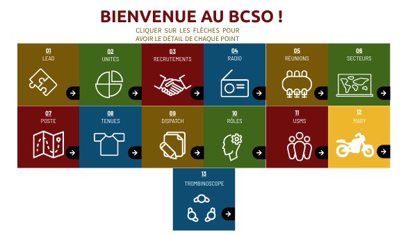 Le BCSO étant un département intégré au sein du LSPD, les réunions se feront le vendredi, comme pour tout autre agent du LSPD. Plus de réunions à part, les remontées se feront les vendredis au même titre que pour tout autre agent. Les réunions sont à la fois chronophages et peuvent être source de discorde. En réunifiant nos réunions avec celle du LSPD, nous affirmons notre volonté de ne former qu'une seule famille et gagnons en efficacité. Il y a en outre des remontées qui concernent l'ensemble des agents, LSPD et BCSO. Ainsi, nous garantissons que les informations passent correctement dans les deux sens. Pour ce qui a trait au fonctionnement interne du BCSO, les ajustements se feront sur le terrain ou en interne directement.