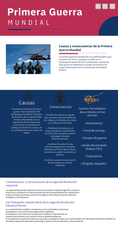 Alejo Marino. (2019). Segunda Revolución Industrial. 5 de Julio de 2021, de https://www.historiando.org/ Sitio web: https://www.historiando.org/segunda- revolucion-industrial/ Consultado. 13/08/2023. • Adriana Morales. (2021). Primera Guerra Mundial. 5 de julio de 2021, de Toda Materia Sitio web: https://www.todamateria.com/primera-guerra- mundial/ Consultado. 13/08/2023. • Erin Blakemore. (2019). ¿Cuáles fueron las causas y consecuencias de la Primera Guerra Mundial? 5 de Julio de 2021, de https://www.nationalgeographic.es/ Sitio web https://www.nationalgeographic.es/historia/2019/04/ cuales fueron-las-causas-y-consecuencias-de-la- primera-guerra-mundial Consultado. 13/08/2023. • Alberto Rojas. (2018). LA GRAN GUERRA Cuatro años de batallas. 6 de Julio de 2021, de El Mundo Sitio web. https://www.elmundo.es/especiales/primera-guerra- mundial/gran-guerra/cuatro-anos-de-batallahtml • El mundo infinito. S/F. "Caracteristicas de paises que fueron potencias imperialistas y sus colonias" Recuperado de: https://elmundoinfinito.com/caracteristicas-paises- potencias-imperialistas-sus-colonias/ Consultado 13/08/2023. • unidad I. Las transformaciones mundiales de la segunda mitad del siglo XIX. Recuperado de: Recursos / Prepa en Linea-SEP. https://g40c2.prepaenlinea.sep.gob.mx/course/view. php?id=42 Consultado. 13/08/2023.