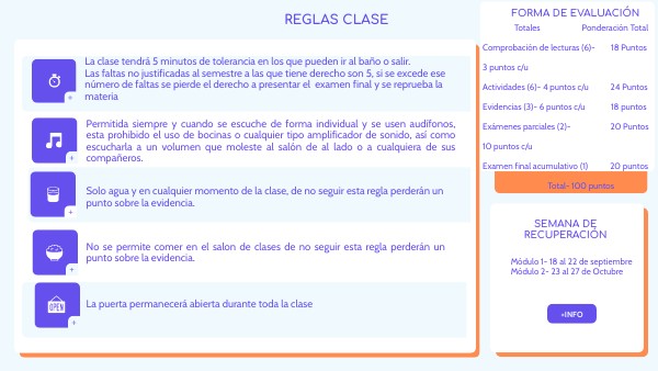 La clase tendrá 5 minutos de tolerancia en los que pueden ir al baño o salir.Las faltas no justificadas al semestre a las que tiene derecho son 5, si se excede ese número de faltas se pierde el derecho a presentar el examen final y se reprueba la materia