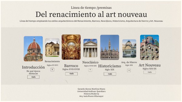 Línea del tiempo empleando los estilos arquitectónicos del Renacimiento, Barroco, Neoclásico, Historicismo, Arquitectura de hierrro y Art. Nouveau