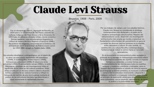 Fue un atrropologo francés. Agregado de filosofía, en 1934 pasó a la Universidad de São Paulo y estudió las culturas indígenas del Mato Grosso y de la Amazonia. En 1941 hubo de exiliarse a Estados Unidos, donde conoció a Roman Jakobson, cuyo estructuralismo lingüístico le influyó de manera decisiva. Regresó a Francia en 1948 y fue profesor de religiones comparadas en la Sorbona y de antropología social en el Colegio de Francia (cuyos cursos de 1959-1982 recogió en Palabra dada, 1984).