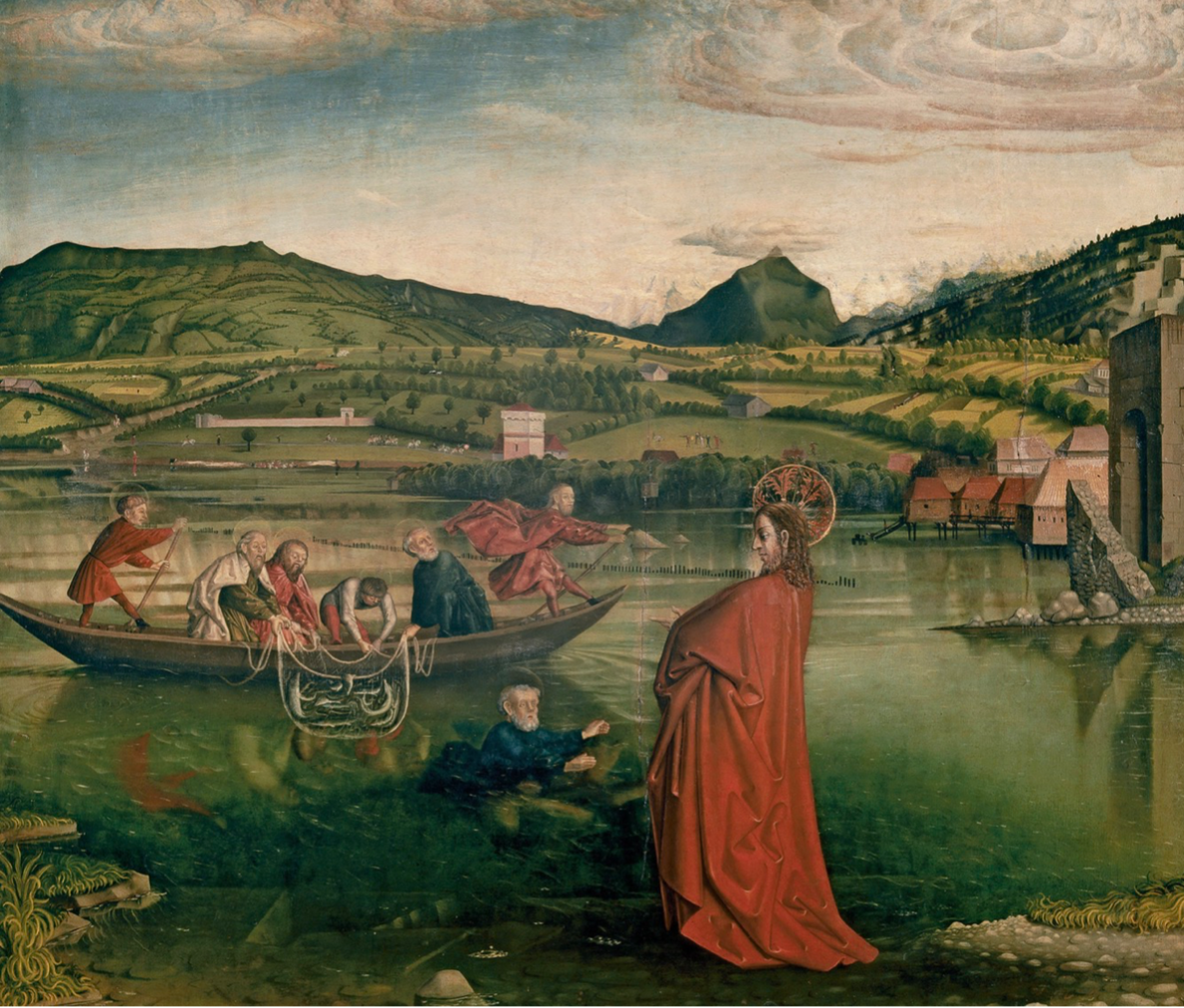 source text:“Then the disciple whom Jesus loved said to Peter, "It is the Lord!" As soon as Simon Peter heard him say, "It is the Lord," he wrapped his outer garment around him (for he had taken it off) and jumped into the water.” Analyze: Now we know why someone jumped into the water, and why these people looked so surprised. The text mentions that when the people were frustrated when they didn't get any fish, Jesus' guidance led them to return with a full load of fish, and the people realized that the person standing in front of them was Jesus, so they were very surprised, and some of them even jumped into the water. The details in the painting show that the person in the water was kneeling down, and from the painting we can know that this person had already realized that the person standing before him was Jesus.