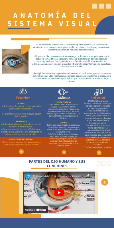 -El globo ocular, es una estructura compleja conformada principalmente por 3 capas: la túnica fibrosa, vascular y nerviosa, el cristalino y dos cavidades, la anterior y la vítrea. Cada parte tiene una función específica para recibir los estímulos visuales del exterior, ajustarlos y transmitir esta información a la corteza, donde es interpretada
