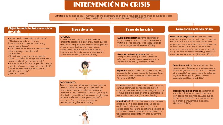 REFERENCIAS BIBLIOGRÁFICAS Guerrero, B. (2023a). Lección 8. Intervención en crisis . Recuperado el 12 de Agosto de 2023, de Campus virtual UVEG : https://avalicmod19c.uveg.edu.mx/course/view.php?id=575&mainsection=4 Guerrero, B. (2023b ). Lección 9. Elementos de las crisis . Recuperado el 12 de Agosto de 2023, de Campus virtual UVEG : https://avalicmod19c.uveg.edu.mx/course/view.php?id=575&mainsection=4 Guerrero, B. (2023c). Lección 10. Reacciones de las crisis. Recuperado el 12 de Agosto de 2023, de Campus virtual UVEG: https://avalicmod19c.uveg.edu.mx/course/view.php?id=575&mainsection=4 Intervención en crisis . (s.f. ). Recuperado el 12 de Agosto de 2023, de TOPDOCTORS : https://www.topdoctors.mx/diccionario-medico/intervencion-en-crisis