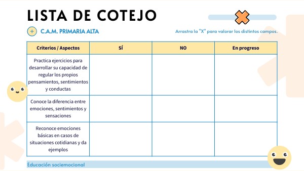 ALUMNO/A O ALUMNOS/AS: CAM PRIMARIA ALTA GRUPO: Quinto y Sexto ÁREA: Educación Socioemocional APRENDIZAJE ESPERADO/COMPETENCIA: Será capaz de desarrollar su capacidad de regular los propios pensamientos, sentimientos y conductas, expresando emociones de manera apropiada, equilibrada y consciente. HABILIDADES: regulación de las emociones. NIVEL DE LOGRO: 5° grado Valora la importancia de generar pensamientos asociados a emociones que le generan bienestar. 6° grado Anticipa los estímulos que conllevan a un estado emocional aflictivo e implementa estrategias preventivas de regulación.