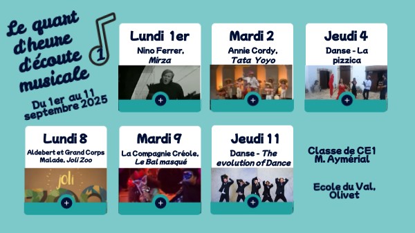 Chaque jour, dans notre classe de CE1, nous terminons la journée avec le maître par une écoute musicale. Nous découvrons des chansons, des musiques et des danses du monde entier. Voici les 6 premiers titres découverts du 4 au 15 septembre 2023.