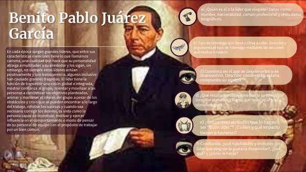 e) ¿Encuentras atributos que lo hagan ser “buen líder”? ¿Cuáles y qué impacto tienen o tuvieron? Claro que si, pues es un icono de nuestra historia de México y toda una figura de líder nato pues ya como presidente, defiende la Constitución de 1857, proclama las Leyes de Reforma y enfrenta con éxito la Intervención Francesa y el Segundo Imperio, preservando la soberanía e independencia de México. Influyo en ese entonces a muchos que creyeron en él y en la revolución de México ya que varios países nos querían gobernar, pero gracias a su influencia no lo lograron pues causo un gran impacto a miles de seguidores que lo apoyaron ciegamente en la lucha por nuestra libertad e independencia. Y como defensor de la soberanía nacional, servidor público austero y como un hombre que gobernó para el pueblo ya que el provenía del mismo pueblo mexicano