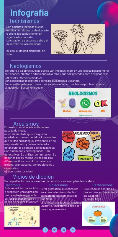 Se refiere a palabras nuevas que se van introduciendo en una lengua para nombrar actividades, objetos o situaciones diversas y que son gestados para designar en la tegnologia nuevos conceptos. Son conciderados legitimos por la Real Academia Española. Son aquellas palabras o giros que se introducen en una lengua por fuerza de uso. ej. googlear: buscar en google.