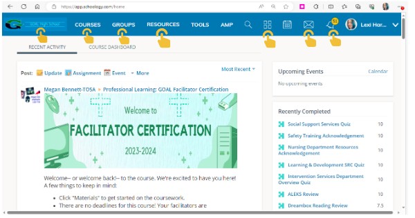 Clicking on Courses takes you to your top courses. These will be courses where you are an admin (teacher) or student. From here you can click on any of these courses to go directly to it. You can also click "My Courses" in the top right corner to get a full list of your courses.