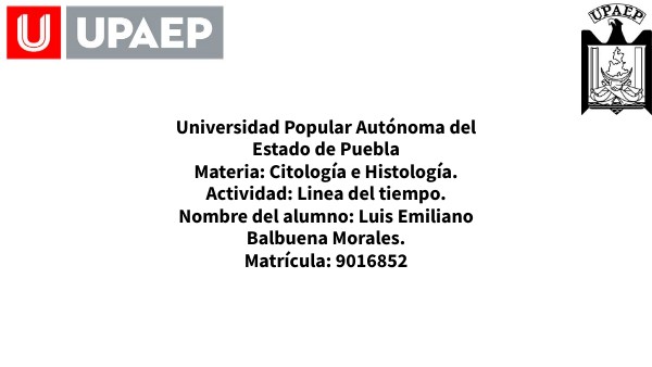 Universidad Popular Autónoma del Estado de Puebla Materia: Citología e Histología. Actividad: Linea del tiempo. Nombre del alumno: Luis Emiliano Balbuena Morales. Matrícula: 9016852