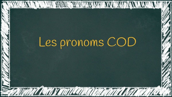 Les pronoms COD sont des mots qui remplacent un nom (une personne, un lieu ou un objet) qui est l’objet direct du verbe, c’est-à-dire qui subit l’action du verbe sans préposition. Par exemple: Je vois un éléphant → Je le vois.