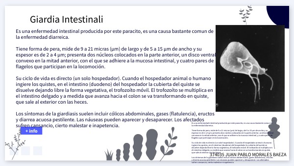 Es una enfermedad intestinal producida por este paracito, es una causa bastante comun de la enfermedad diarreica. Tiene forma de pera, mide de 9 a 21 micras (μm) de largo y de 5 a 15 μm de ancho y su espesor es de 2 a 4 μm; presenta dos núcleos colocados en la parte anterior, un disco ventral convexo en la mitad anterior, con el que se adhiere a la mucosa intestinal, y cuatro pares de flagelos que participan en la locomoción. Su ciclo de vida es directo (un solo hospedador). Cuando el hospedador animal o humano ingiere los quistes, en el intestino (duodeno) del hospedador la cubierta del quiste se disuelve dejando libre la forma vegetativa, el trofozoíto móvil. El trofozoíto se multiplica en el intestino delgado y a medida que avanza hacia el colon se va transformando en quiste, que sale al exterior con las heces. Los síntomas de la giardiasis suelen incluir cólicos abdominales, gases (flatulencia), eructos y diarrea acuosa pestilente. Las náuseas pueden aparecer y desaparecer. Los afectados sufren cansancio, cierto malestar e inapetencia.