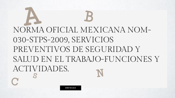1. Objetivo2. Campo de aplicación 3. Definiciones 4. Obligaciones del patrón 5. Funciones y actividades del responsable de seguridad y salud en el trabajo 6. Diagnóstico de seguridad y salud en el trabajo 7. Programa de seguridad y salud en el trabajo o relación de acciones preventivas y correctivas de seguridad y salud en el trabajo 8. Unidades de verificación 9. Procedimiento para la evaluación de la conformidad 10. Vigilancia 11. Bibliografía 12. Concordancia con normas internacionales
