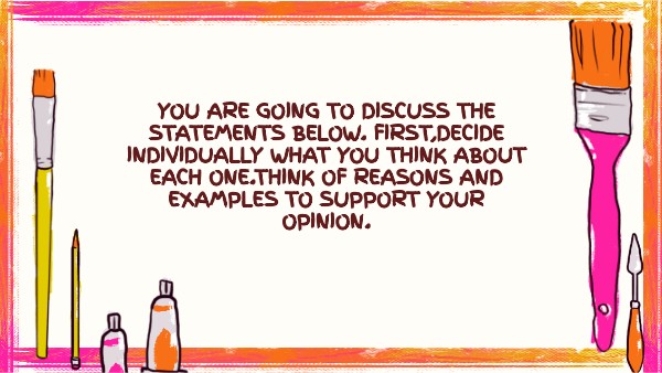 you are goıng to dıscuss the statements below. Fırst,decıde ındıvıdually what you thınk about each one.thınk of reasons and examples to support your opınıon.