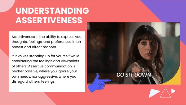 Assertiveness is the ability to express your thoughts, feelings, and preferences in an honest and direct manner. It involves standing up for yourself while considering the feelings and viewpoints of others. Assertive communication is neither passive, where you ignore your own needs, nor aggressive, where you disregard others' feelings.