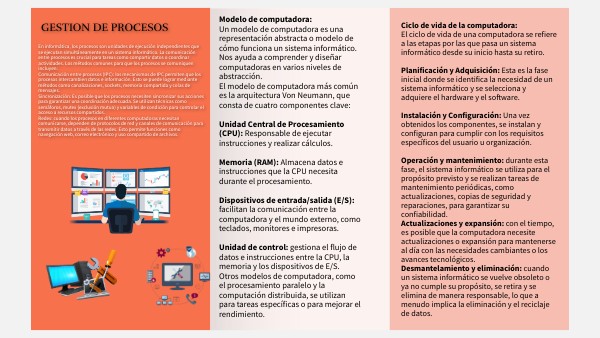 Ciclo de vida de la computadora: El ciclo de vida de una computadora se refiere a las etapas por las que pasa un sistema informático desde su inicio hasta su retiro. Planificación y Adquisición: Esta es la fase inicial donde se identifica la necesidad de un sistema informático y se selecciona y adquiere el hardware y el software. Instalación y Configuración: Una vez obtenidos los componentes, se instalan y configuran para cumplir con los requisitos específicos del usuario u organización. Operación y mantenimiento: durante esta fase, el sistema informático se utiliza para el propósito previsto y se realizan tareas de mantenimiento periódicas, como actualizaciones, copias de seguridad y reparaciones, para garantizar su confiabilidad. Actualizaciones y expansión: con el tiempo, es posible que la computadora necesite actualizaciones o expansión para mantenerse al día con las necesidades cambiantes o los avances tecnológicos. Desmantelamiento y eliminación: cuando un sistema informático se vuelve obsoleto o ya no cumple su propósito, se retira y se elimina de manera responsable, lo que a menudo implica la eliminación y el reciclaje de datos.