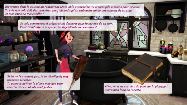 Bienvenue dans la cuisine du restaurant Math'able ensorcelée, tu arrives pile à temps pour m'aider. Tu sais que cela fait des semaines que j'attends qu'on embauche un ou une commis de cuisine. Je suis ravie de t'accueillir !