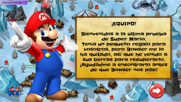 ¡EQUIPO!Bienvenidos a la última prueba de Super Mario. Tenía un pequeño regalo para vosotros, pero Bowser me lo ha quitado, así que he venido a sus tierras para recuperarlo. ¡Ayudádme a encontrarlo antes de que Bowser nos pille!