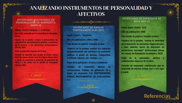 Referencias ALFONSO BARRETO NEUROLÚDICA. (11 de mayo de 2021). IRT - INVENTARIO DE RASGOS TEMPERAMENTALES. YouTube: https://www.youtube.com/watch?v=LL51hSRyyhg Campo, N. (s.f.). Instrumentos de personalidad.De Evaluación psicológica en adultos v2.[Módulo en línea].Universidad Virtual del Estado de Guanajuato: https://avalicmod19c.uveg.edu.mx/mod/scorm/player.php?a=4192¤torg=EPA_U3_L8_ORG&scoid=8964 CENTRO PEDAGOGICO INGENIUS. (5 de febrero de 2022). CUESTIONARIO DEL MMPI-2 PARTE 1 (Clase del 5 de febrero).[Vídeo].YouTube: https://www.youtube.com/watch?v=zlMRD06xufY DISTRIBUIDORA PSIQUE INSTRUMENTOS DE EVALUACIÓN. (s.f.). Inventario de Rasgos Temperamentales (IRT). DISTRIBUIDORA PSIQUE INSTRUMENTOS DE EVALUACIÓN: https://distribuidorapsique.com/inventario-de-rasgos-temperamentales-irt Jurado, S., Loperena, V., Mendez, L., Rodríguez, F., Varela, R., & Villegas, M. (1998). La estandarización del Inventario de Depresión de Beck para los residentes de la ciudad de México. Salud Mental Publicación oficial del Instituto Nacional de Psiquiatría Ramón de la Fuente Muñiz, 21(3). http://www.revistasaludmental.mx/index.php/salud_mental/article/view/706/0 Rovira, I. (2023). Inventario Multifásico de Personalidad de Minnesota (MMPI-2): ¿cómo es?.Psicología y Mente: https://psicologiaymente.com/personalidad/inventario-multifasico-personalidad-de-minnesota-2 Tratamiento Ansiedad Depresión. (2023). Test de depresión.Tratamiento Ansiedad Depresión: https://tratamiento-ansiedad-depresion.com/test-depresion.html Universidad Virtual del estado de Guanajuato Académico. (26 de julio de 2022). Inventario de depresión de Beck.[Vídeo].YouTube: https://www.youtube.com/watch?v=cBYbKT43X9M
