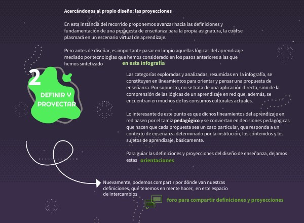 Las categorías exploradas y analizadas, resumidas en la infografía, se constituyen en lineamientos para orientar y pensar una propuesta de enseñanza. Por supuesto, no se trata de una aplicación directa, sino de la comprensión de las lógicas de un aprendizaje en red que, además, se encuentran en muchos de los consumos culturales actuales. Lo interesante de este punto es que dichos lineamientos del aprendizaje en red pasen por el tamiz pedagógico y se conviertan en decisiones pedagógicas que hacen que cada propuesta sea un caso particular, que responda a un contexto de enseñanza determinado por la institución, los contenidos y los sujetos de aprendizaje, básicamente. Para guiar las definiciones y proyecciones del diseño de enseñanza, dejamos estas