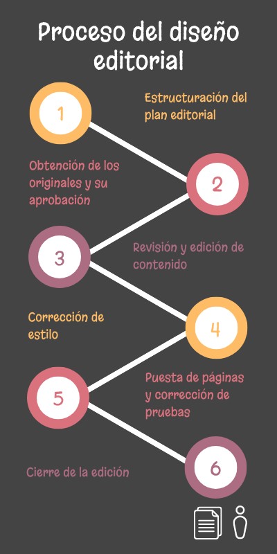 Una vez hechas todas las correcciones, el diseñador editorial se dedica a trabajar en la diagramación del documento, eligiendo el formato, la retícula, la tipografía, el color y los elementos gráficos más adecuados. El escrito pasa por más pruebas para pulir todos los elementos hasta obtener el original gráfico.