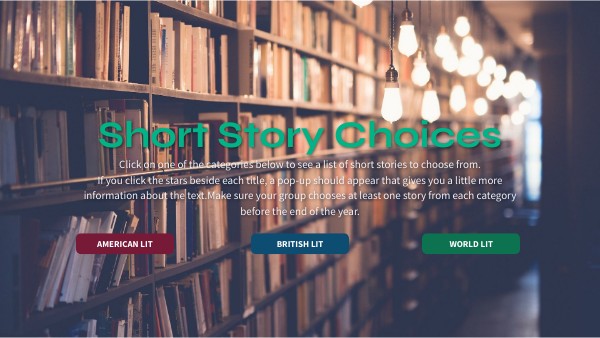 Click on one of the categories below to see a list of short stories to choose from. If you click the stars beside each title, a pop-up should appear that gives you a little more information about the text.Make sure your group chooses at least one story from each category before the end of the year.