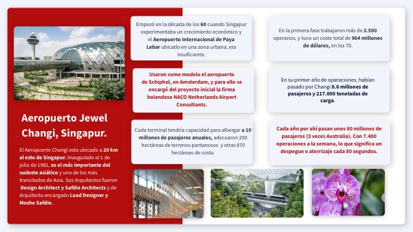 El Aeropuerto Changi esta ubicado a 20 km al este de Singapur. Inaugurado el 1 de julio de 1981, es el más importante del sudeste asiático y uno de los más transitados de Asia. Sus Arquitectos fueron Design Architect y Safdie Architects y de Arquitecto encargado Lead Designer y Moshe Safdie.