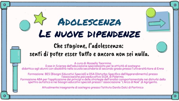 A cura di: Rossella TaorminaD.ssa in Scienze dell'educazione specializzata per le attività di sostegno didattico agli alunni con disabilità nella scuola secondaria di secondo grado presso l'università Kore di Enna Formazione BES (Bisogni Educativi Speciali) e DSA (Disturbo Specifico dell’Apprendimento) presso l’associazione psicoeducativa SI.DA. di Palermo. Formazione ABA per l'applicazione dei principi e delle strategie dell'analisi comportamentale nei disturbi dello spettro autistico e nei bisogni educativi speciali presso l’ associazione ”L’Arca di Noè" di Agrigento. Attualmente insegnante di sostegno presso l'Istituto Danilo Dolci di Partinico