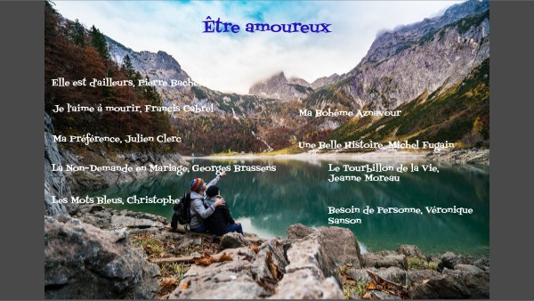Le thème de votre chanson est l'amour. Vous pouvez piocher le thème de votre chanson dans une des catégories proposées dans ce genially.