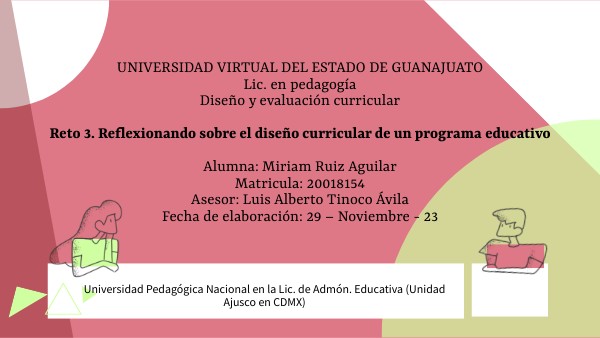 UNIVERSIDAD VIRTUAL DEL ESTADO DE GUANAJUATO Lic. en pedagogía Diseño y evaluación curricular Reto 3. Reflexionando sobre el diseño curricular de un programa educativo Alumna: Miriam Ruiz Aguilar Matricula: 20018154 Asesor: Luis Alberto Tinoco Ávila Fecha de elaboración: 29 – Noviembre - 23