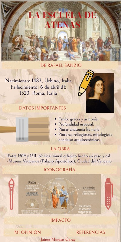 Imaginario, A. (2020). La Escuela de Atenas de Rafael Sanzio: análisis y significado. Cultura Genial. Recuperado el 17 de agosto del 2023 en https://www.culturagenial.com/es/la-escuela-de-atenas-de-rafael-sanzio/La Escuela de Atenas - Rafael Sanzio. (2022). HA! Recuperado el 17 de agosto del 2023 en https://historia-arte.com/obras/la-escuela-de-atenas-de-rafael#:~:text=Obra%20magna%20del%20renacimiento%20y%20de%20la%20historia%20del%20arte%20universal.&text=T%C3%A9cnica%3A%20Fresco%20(500%20x%20770%20cm.)