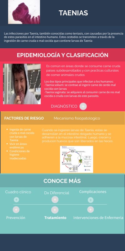 Las infecciones por Taenia, también conocidas como teniasis, con causadas por la presencia de estos parasitos en el intestino humano. Estos cestodos se transmiten a través de la ingestión de carne cruda o mal cocida que contiene larvas de Taenia