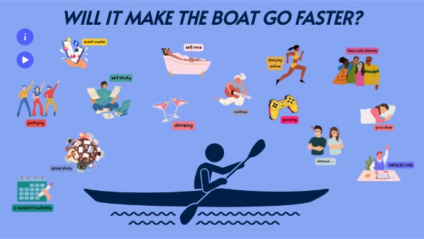 "Will it make the boat go faster?" You can ask yourself this question to help you focus on achieving your goals. It's a way of working out what is contributing to, and what is distracting you from, success. Watch the video (press the play button below the info button) to learn where this question comes from and the impact it can have. Once you've done that, drag and drop the pictures to decide what goes in your boat! (You can work alone or debate it as a team.)