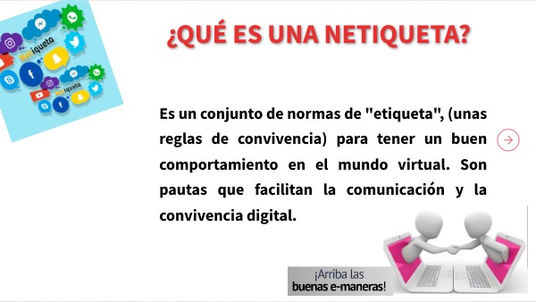 Es un conjunto de normas de "etiqueta", (unas reglas de convivencia) para tener un buen comportamiento en el mundo virtual. Son pautas que facilitan la comunicación y la convivencia digital.