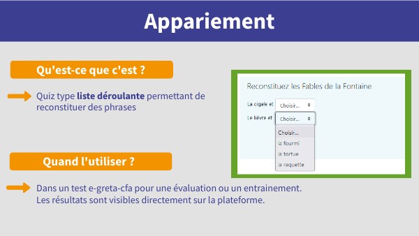 Quiz type liste déroulante permettant de reconstituer des phrases