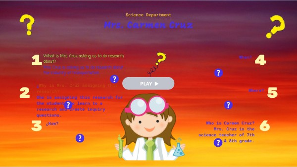 ¿Why is Mrs. Cruz assigning this research?She is assigning this research for the students to learn to a research and create inquiry questions.