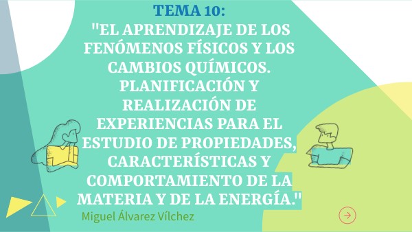 TEMA 10: "EL APRENDIZAJE DE LOS FENÓMENOS FÍSICOS Y LOS CAMBIOS QUÍMICOS. PLANIFICACIÓN Y REALIZACIÓN DE EXPERIENCIAS PARA EL ESTUDIO DE PROPIEDADES, CARACTERÍSTICAS Y COMPORTAMIENTO DE LA MATERIA Y DE LA ENERGÍA."