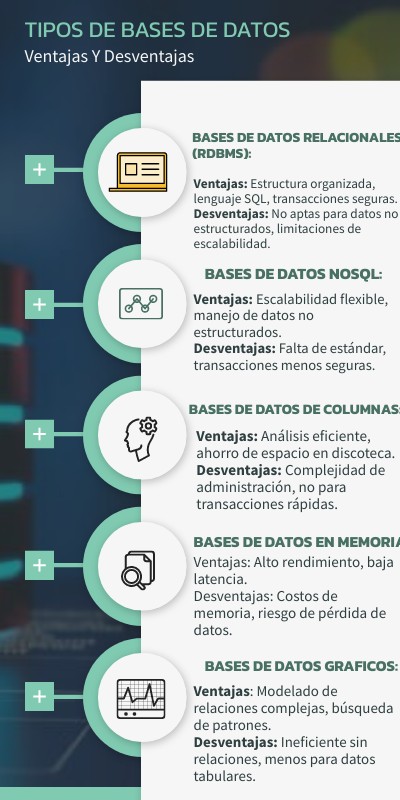 Ventajas: Estructura organizada, lenguaje SQL, transacciones seguras. Desventajas: No aptas para datos no estructurados, limitaciones de escalabilidad.