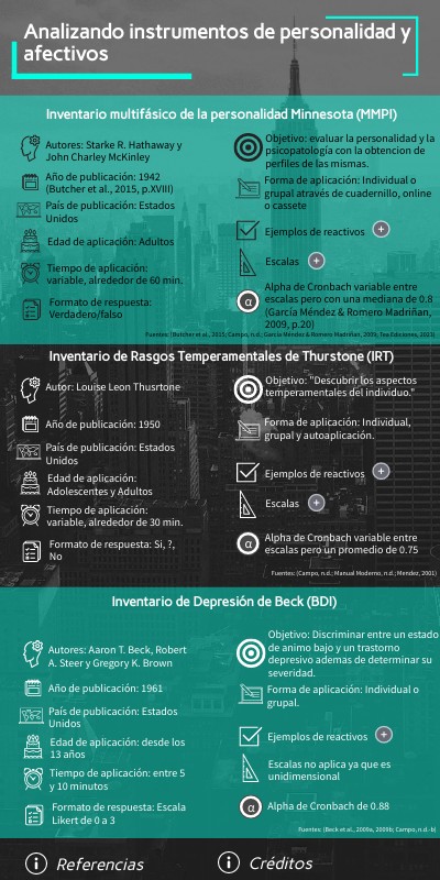 Beck, A. T., Steer, R. A., & Brown, G. K. (2009a). BDI-II Protocolo de Aplicación.pdf. Beck, A. T., Steer, R. A., & Brown, G. K. (2009b). BECK - BDI-II Manual.pdf (pp. 1–85). Butcher, J., Graham, J., Tellegen, A., & Dahlstrom, G. (2015). MMPI-2. Manual de aplicación, calificación e interpretación. Manual Moderno. Campo, N. (n.d.-a). Lección 8. Instrumentos de personalidad. Universidad Virtual del Estado de Guanajuato. https://avalicmod19c.uveg.edu.mx/mod/scorm/player.php?a=4192¤torg=EPA_U3_L8_ORG&scoid=8964 Campo, N. (n.d.-b). Lección 9. Inventarios de depresión para adultos. Universidad Virtual del Estado de Guanajuato. https://view.genial.ly/62e00c0983f12a001829018c/interactive-content-epau3l9infografia García Méndez, G. A., & Romero Madriñan, J. C. (2009). Comparación de las propiedades psicométricas del MMPI y el MMPI-2 en una muestra de universitarios bogotanos. Revista Colombiana de Psicología, 18, 19–31. Manual Moderno. (n.d.). Inventario de Rasgos Temperamentales. Ficha técnica. Manual Moderno. https://libreriaolejnik.com/fichas/25856.pdf Mendez, A. (2001). Inventario de Rasgos Temperamentales de Thurstone. Manual Moderno. https://kupdf.net/download/inventario-de-rasgos-de-cornell_5cfca071e2b6f5aa5905cb66_pdf Tea Ediciones. (2023). MMPI®-2. Inventario Multifásico de Personalidad de Minnesota®-2 (c). https://web.teaediciones.com/MMPI-2--INVENTARIO-MULTIFASICO-DE-PERSONALIDAD-DE-MINNESOTA-2.aspx