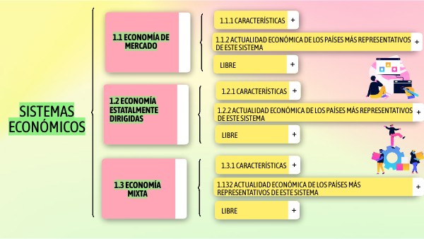 Glosario1. Sistemas económicos: Conjunto de reglas y normas básicas, técnicas e institucionales que regulan las actividades económicas del ser humano desde el inicio de las comunidades, con el propósito de facilitar la convivencia en un entorno de recursos materiales limitados.2.Economías de mercado: " Es un sistema económico regido, regulado y orientado únicamente por los mercados. La tarea de asegurar el orden en la producción y distribución de bienes es confiada a ese mecanismo autorregulador. Lo que se espera es que los seres humanos se comporten de forma que puedan ganar el máximo dinero posible. Tal es el origen de una economía de este tipo". 3.Economías estatalmente dirigidas: Es el sistema económico en el que la burocracia central toma todas las decisiones sobre producción, cantidad y precio de bienes y servicios puede llevar a ineficiencias, escasez y mercados negros. La planificación central es aceptable en países de bajos ingresos. 4.Economía mixta: el sistema económico de un país o territorio que combina elementos de dos o más sistemas económicos diferentes o, incluso, contrarios entre sí; tiene como base el capitalismo y, en él, los agentes económicos actúan según las reglas del mercado, la oferta y la demanda, en todos sus aspectos como el mercado de bienes y servicios o el mercado laboral. 5.Sistema Económico Contemporáneo: Un sistema económico contemporáneo se refiere a la forma en que se organiza y gestiona la economía en la actualidad. Incluye aspectos como la producción, distribución y consumo de bienes y servicios, así como las políticas y regulaciones que influyen en estos procesos