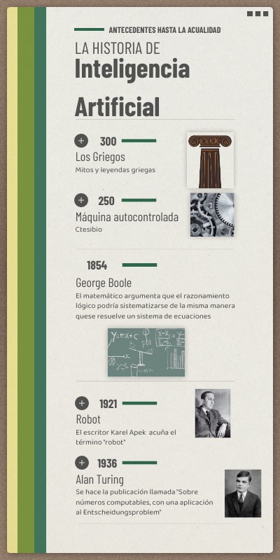 [1]"¿Qué es la inteligencia artificial?¿Cuál es su historia?" https://www.zendesk.com.mx/blog/historia-inteligencia-artificial/ (Accdido: 2023-08-19).[2]"Breve historia de la Inteligencia Artificial". www.nationalgeographic.com.es. https://www.nationalgeographic.com.es/ciencia/breve-historia-de-la-inteligencia-artificial_19310 (accedido el 19 de agosto de 2023). [3]"La historia de la Inteligencia Artificial ð§ ð¤| OpenMind". OpenMind. https://www.bbvaopenmind.com/tecnologia/inteligencia-artificial/historia-de-la-inteligencia-artificial/ (accedido el 19 de agosto de 2023). [4]Historia y Vida. "¿Qué aportó a la ciencia Alan Turing?" La Vanguardia. https://www.lavanguardia.com/historiayvida/historia-contemporanea/20180611/47312986353/que-aporto-a-la-ciencia-alan-turing.html#foto-4 (accedido el 19 de agosto de 2023). [5]"This week in The History of AI at AIWS.net – the Dartmouth Conference began on 18 June 1956 | AIWS.net". AIWS.net | For a better world with AI. https://aiws.net/the-history-of-ai/this-week-in-the-history-of-ai-at-aiws-net-the-dartmouth-conference-began-on-18-june-1956-2/ (accedido el 19 de agosto de 2023).
