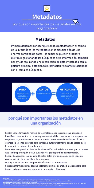 Bibliografia- Real Academia Española. Metadatos. Diccionario de la lengua española (23.ª edición). https://dle.rae.es/meta - Senso, José Antonio; Rosa Piñero, Alberto de la (2003). «El concepto de metadato. Algo más que descripción de recursos electrónicos». http://www.scielo.br/pdf/ci/v32n2/17038.pdf/ vol. 32, n. 2: 95-106. - Feria Basurto, L. (2007). Metadatos para la sociedad de la información: encontrando la aguja en el pajar. Páginas 3-6, Revista Bibliotecas. Vol. 25, No. 1, 2007. Red Universidad Nacional de Costa Rica. https://elibro-net.bibliotecavirtual.unad.edu.co/es/ereader/unad/23376?page=3.